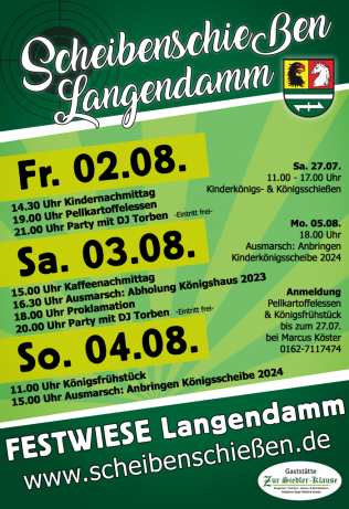 TERMINE03.07.2024 Treffen der Vertreter der Vereine (19 Uhr, KKSV)29.08.2024 Ortsratssitzung (19 Uhr)27.07.2024 Königsschießen02.08.2024 Fischessen03.-05.08.2024 Scheibenfest128. Ausgabe Nachrichten für Langendamm "Im Wohle" erschienen... WEITERLESEN + Archiv HIER